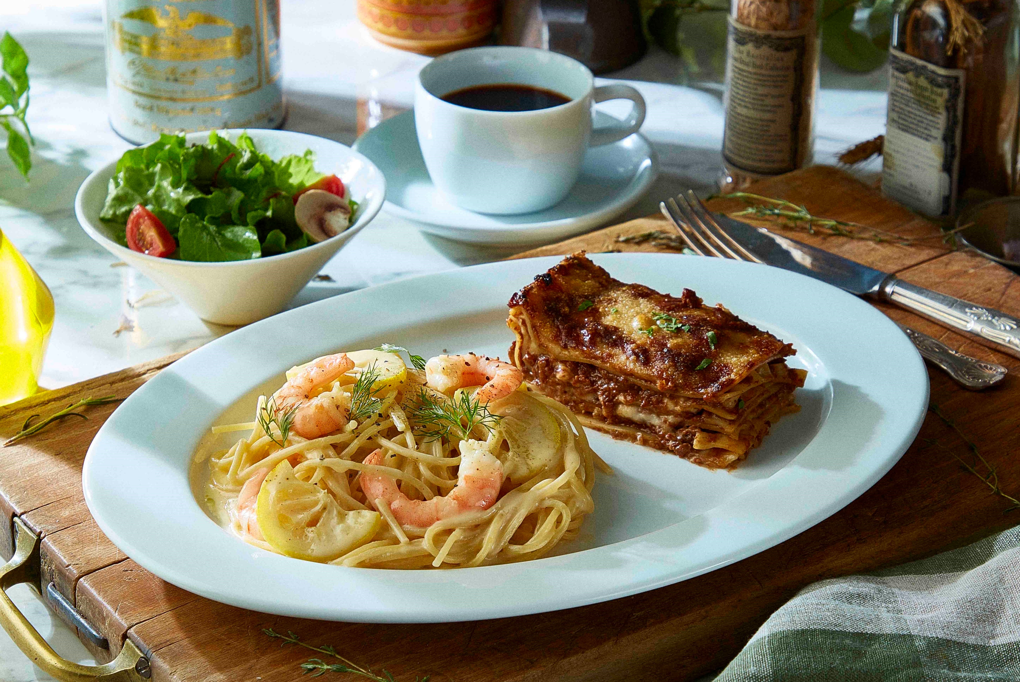 毎日お店で焼き上げるラザニアと3種からお選びいただけるパスタのセットです