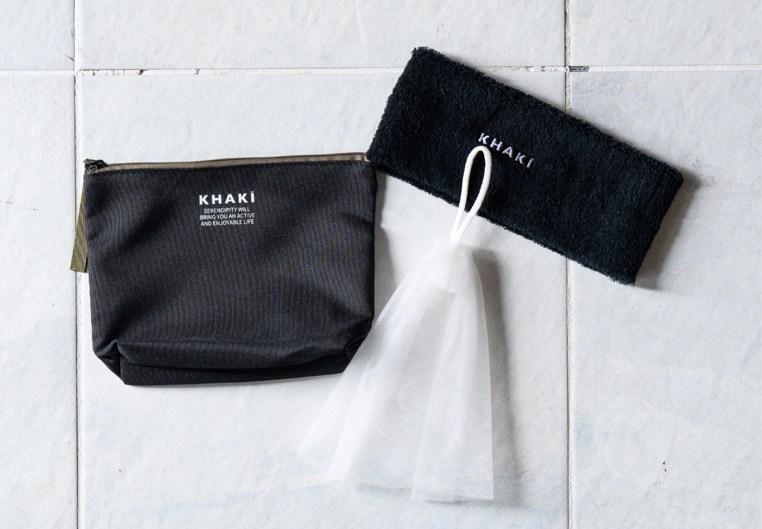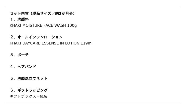 KHAKI SKINCARE COFFRET ¥8360(洗顔料・オールインワンローション・ポーチ・ヘアバンド・洗顔泡立てネット・ギフトボックス・紙袋付き)