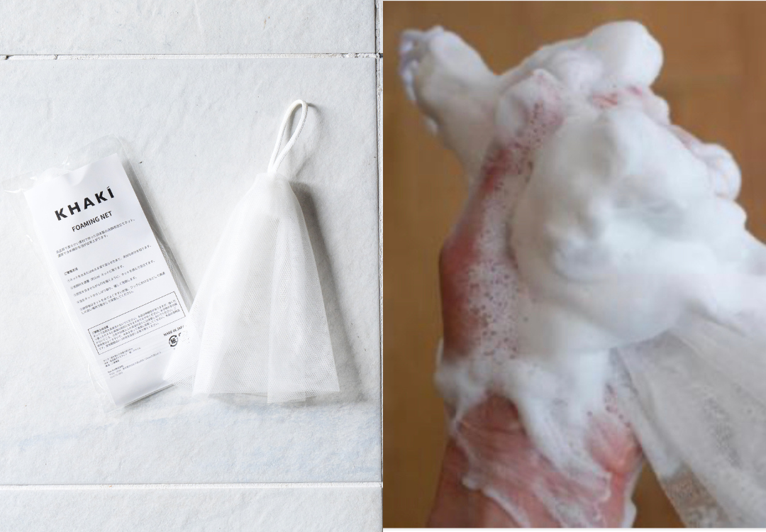 泡立ちの良いKHAKIの洗顔フォームと相性の良い洗顔ネット。しっかりとした素材の2枚重ねのネットでもっちり泡を作れます。