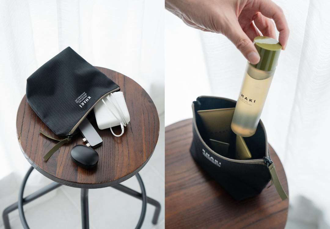 防水仕様の生地で、スキンケアはもちろん、濡らしたくない充電コード、モバイルバッテリー、イヤホン、スマホガジェットを入れて持ち運ぶのにもおすすめ。