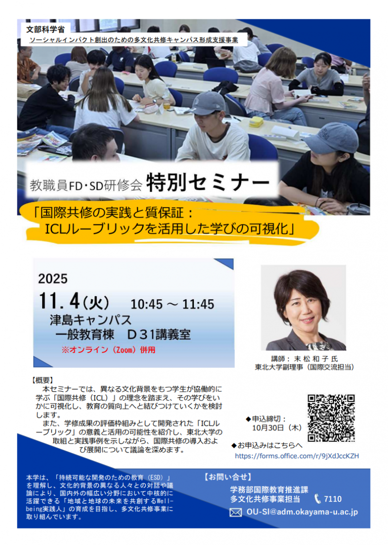 国立大学法人岡山大学(本部:岡山市北区、学長:那須保友)は、2025年11月4日、2024年度に文部科学省より採択を受けた「ソーシャルインパクト創出のための多文化共修キャンパス形成支援事業(多文化共修事業)」の一環として、同事業採択大学である東北大学副理事(国際交流担当)の末松和子氏を招き、特別セミナー「国際共修の実践と質保証:ICL※ルーブリックを活用した学びの可視化」をハイブリッド形式で開催し、約100人の教職員が参加しました。