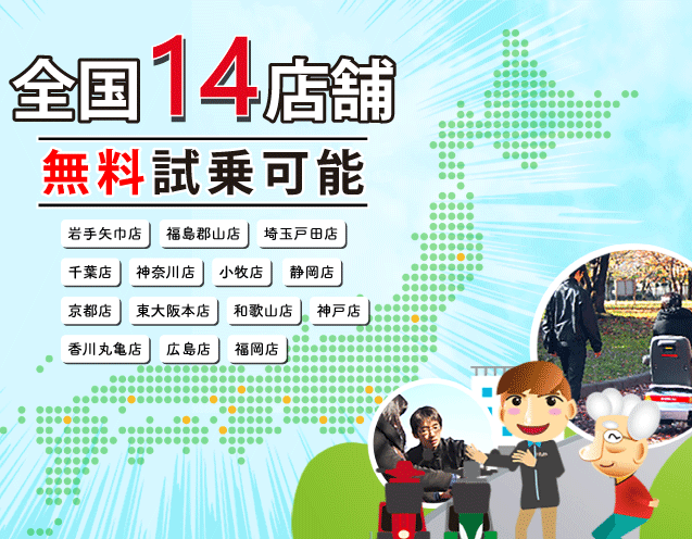 全国14店舗無料試乗可能岩手矢巾店/福島郡山店/埼玉戸田店/千葉店/横浜店/小牧店