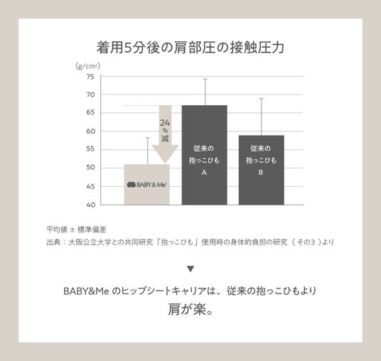 ・BABY&Meのヒップシートキャリアは、一般的な腰ベルトタイプの抱っこひもと比較して肩部圧の接触圧力が最大24%減少。