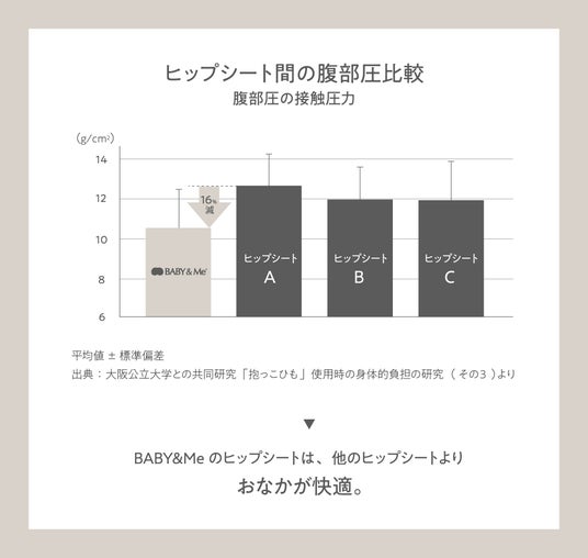 ・BABY&Meのヒップシートは、他社のヒップシートと比較して腹部圧による負担が最大16%減少。