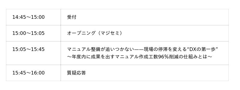 DX推進担当者・情報システム部門・業務改革リーダーを対象に、マニュアル作成工数96%削減を実現するナレッジDX手法 を中心にした講演・デモンストレーション・質疑応答を実施する60分構成のオンラインイベントとなります。参加者は、属人化の解消・引継ぎ停滞の改善・年度内で成果を出すDX推進ノウハウ を通じて、業務改善や新規施策立案のヒントを得ることができます。