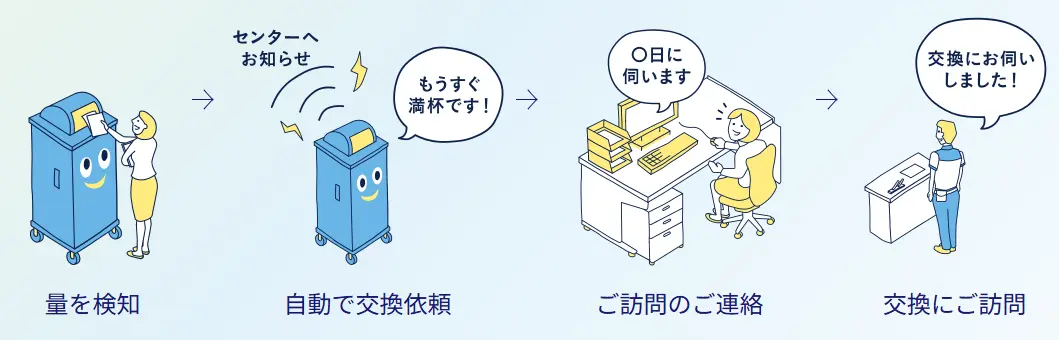 - 回収訪問:センターから交換日をご連絡し、担当スタッフがオフィスを訪問。文書が投入された満杯のボックスを回収し、空のボックスに交換します。