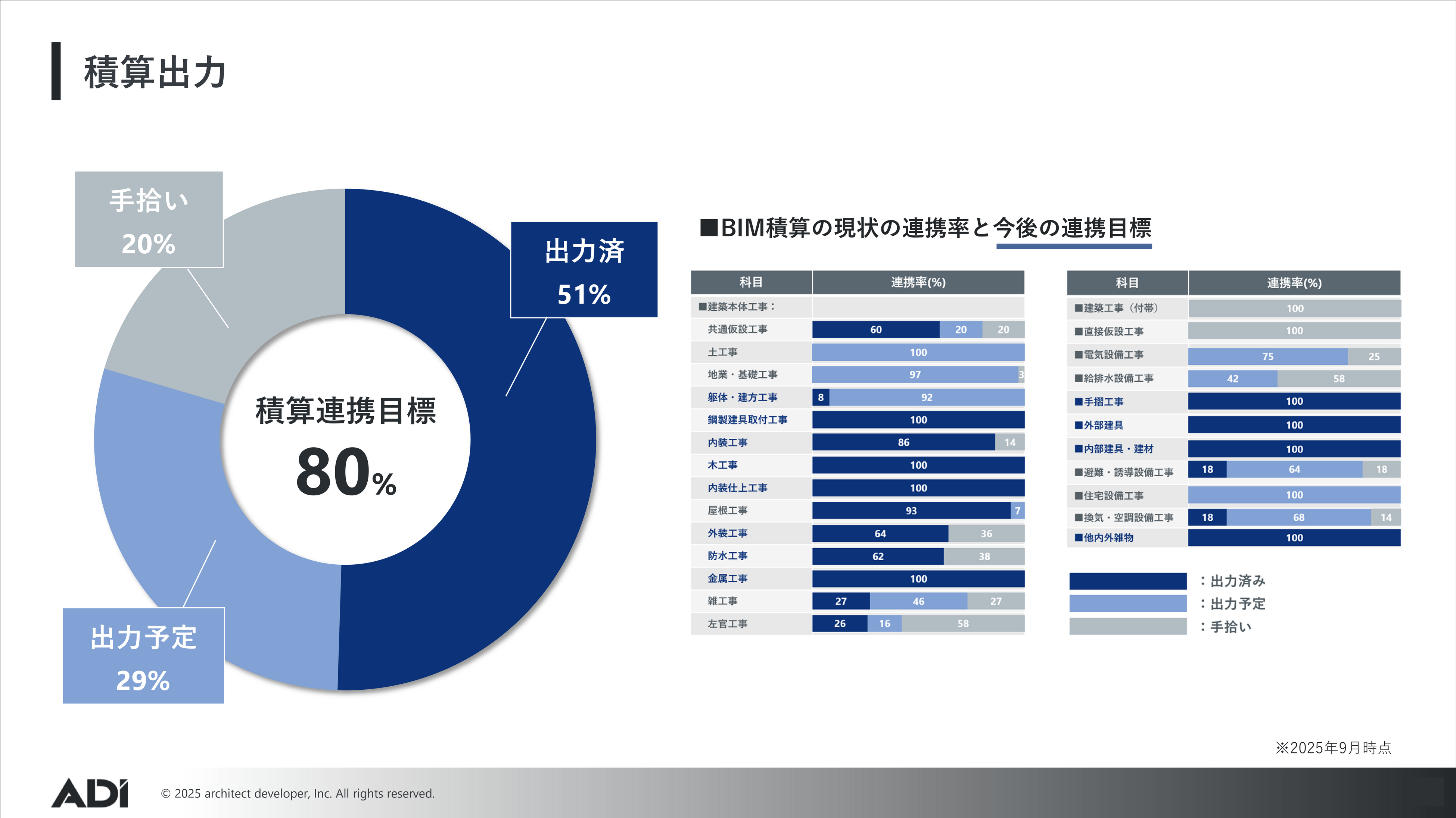 ADIは2024年7月から意匠図、2025年1月からは構造・設備図について、Archicadで作成したBIMモデルから確認申請図面を作成する運用開始に向けた体制を整えています。積算においては、BIMモデルから数量を直接出力するシステムを専用開発し、2025年9月時点で51%の積算連携を実現、残り29%についても出力準備を進めており、連携率80%の達成を目指しています。