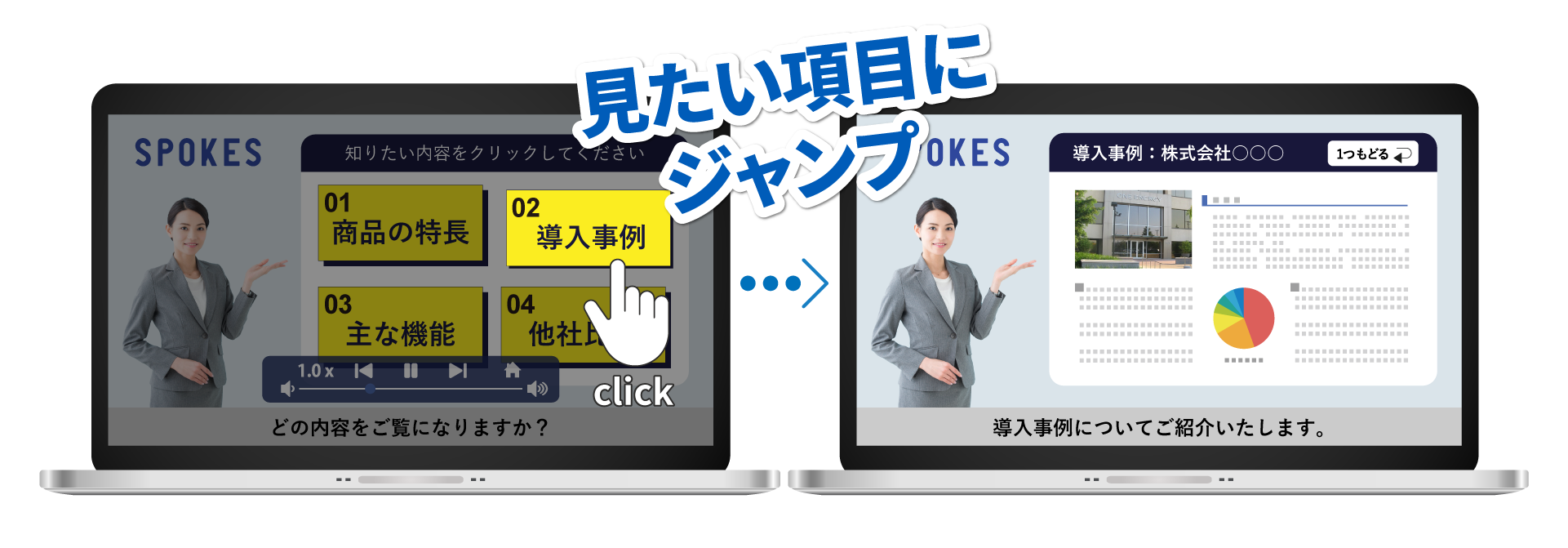 視聴者が見たいページをクリックして視聴できる「視聴者参加型のインタラクティブ動画」を作成できます。一方的に動画を見るのではなく、視聴者自らが知りたい情報を選択することが可能です。