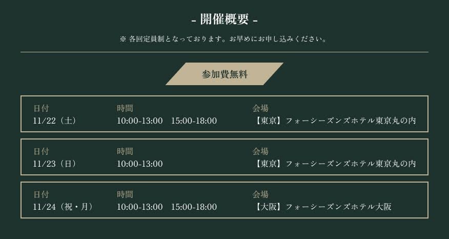 - 日程:11/22(土) 10:00-13:00/15:00-18:00、11/23(日) 10:00-13:00(東京)/ 11/24(祝・月) 10:00-13:00/15:00-18:00(大阪)