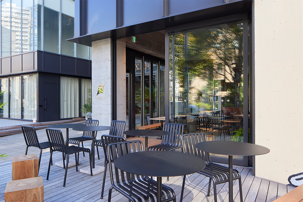 カフェのエントランスに面した開放的なデッキテラスは、撮影やポップアップなどに最適なロケーション。
