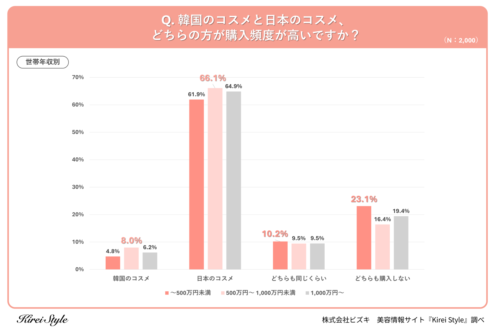 一方で、韓国コスメ・日本コスメの購入頻度は、年収と明確な比例・反比例の関係にはありませんでした。