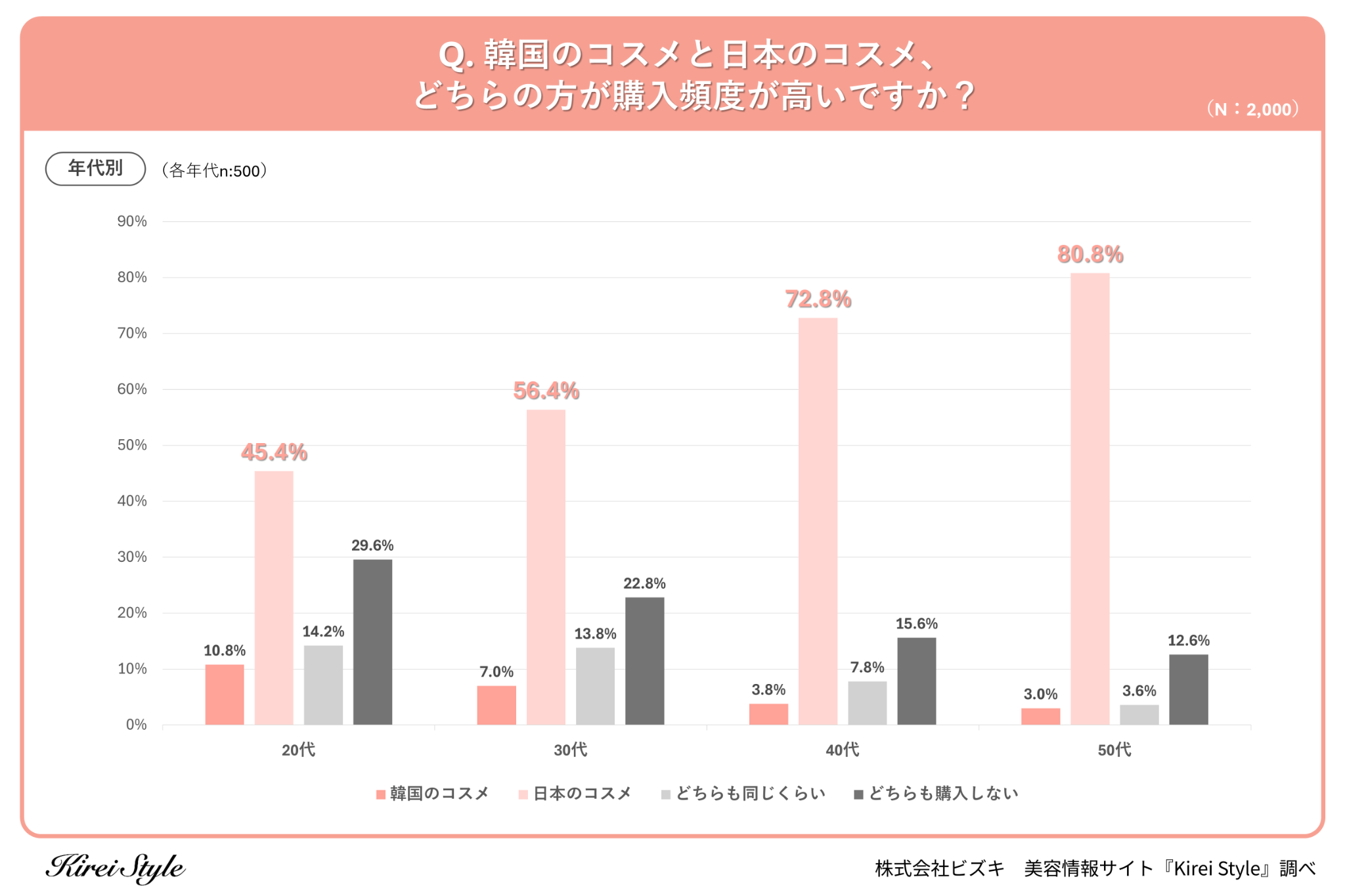 対照的に、「日本のコスメ」の購入頻度が(韓国コスメより)高い層は、年代が上がるにつれて一貫して増加し、50代では80.8%に達しました。若年層はトレンドの韓国コスメも積極的に取り入れる一方、年代が上がるにつれて品質や長年の使用感への信頼から「日本コスメ」を選択する傾向が強まることがうかがえます。
