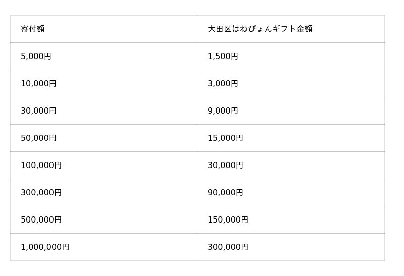 ■寄付額と取得できる「大田区はねぴょんギフト」の金額