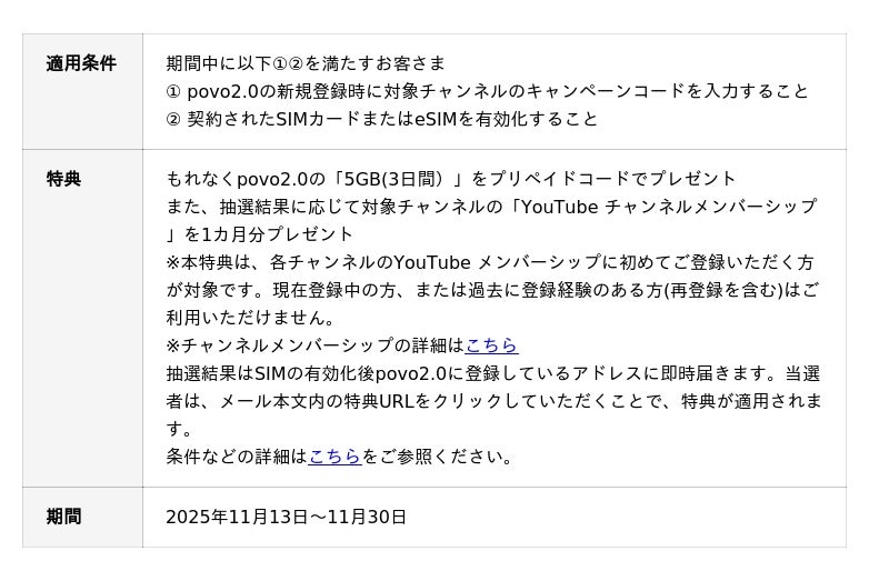 KDDI、沖縄セルラーは2025年11月13日から11月30日まで、povo2.0に新規加入いただくと、もれなく「5GB(3日間)」に加え、抽選で「YouTube チャンネルメンバーシップ」1カ月無料コードが90%の確率で当たるキャンペーンの第2弾を実施します。