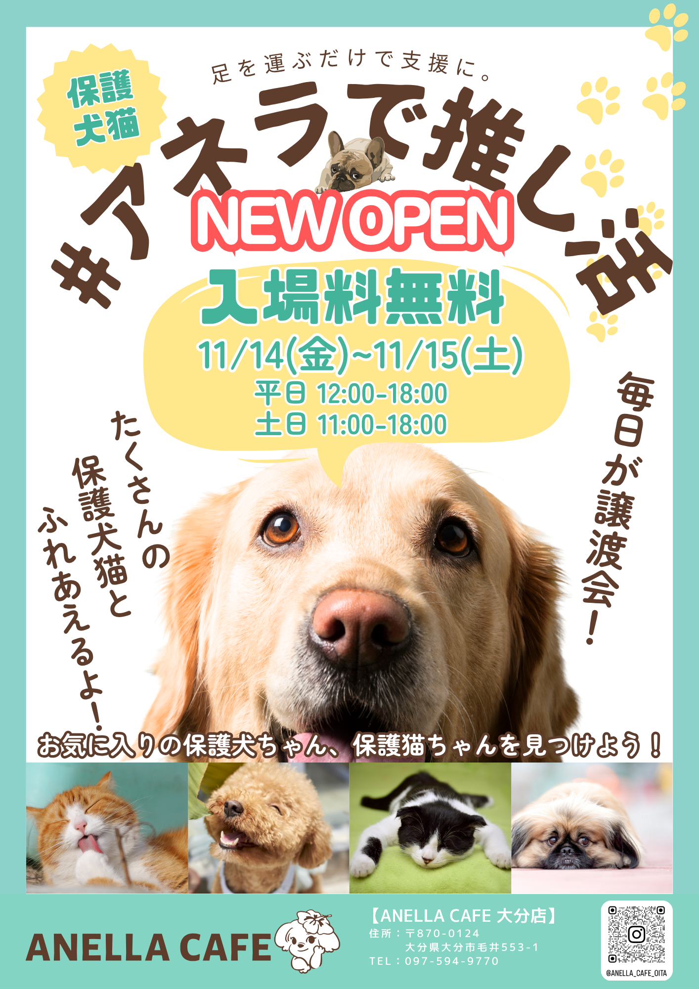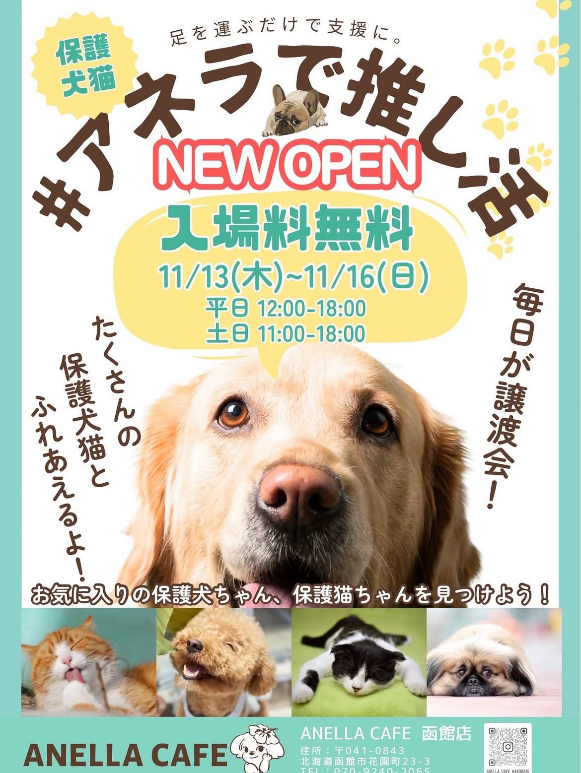 【北の函館×南の大分を日本縦断】福祉型保護犬猫ふれあいカフェ「ANELLA CAFE」11月13日(木)函館店/14日(金)大分店を連日オープン-“ずっとの家族探し”を全国へ。