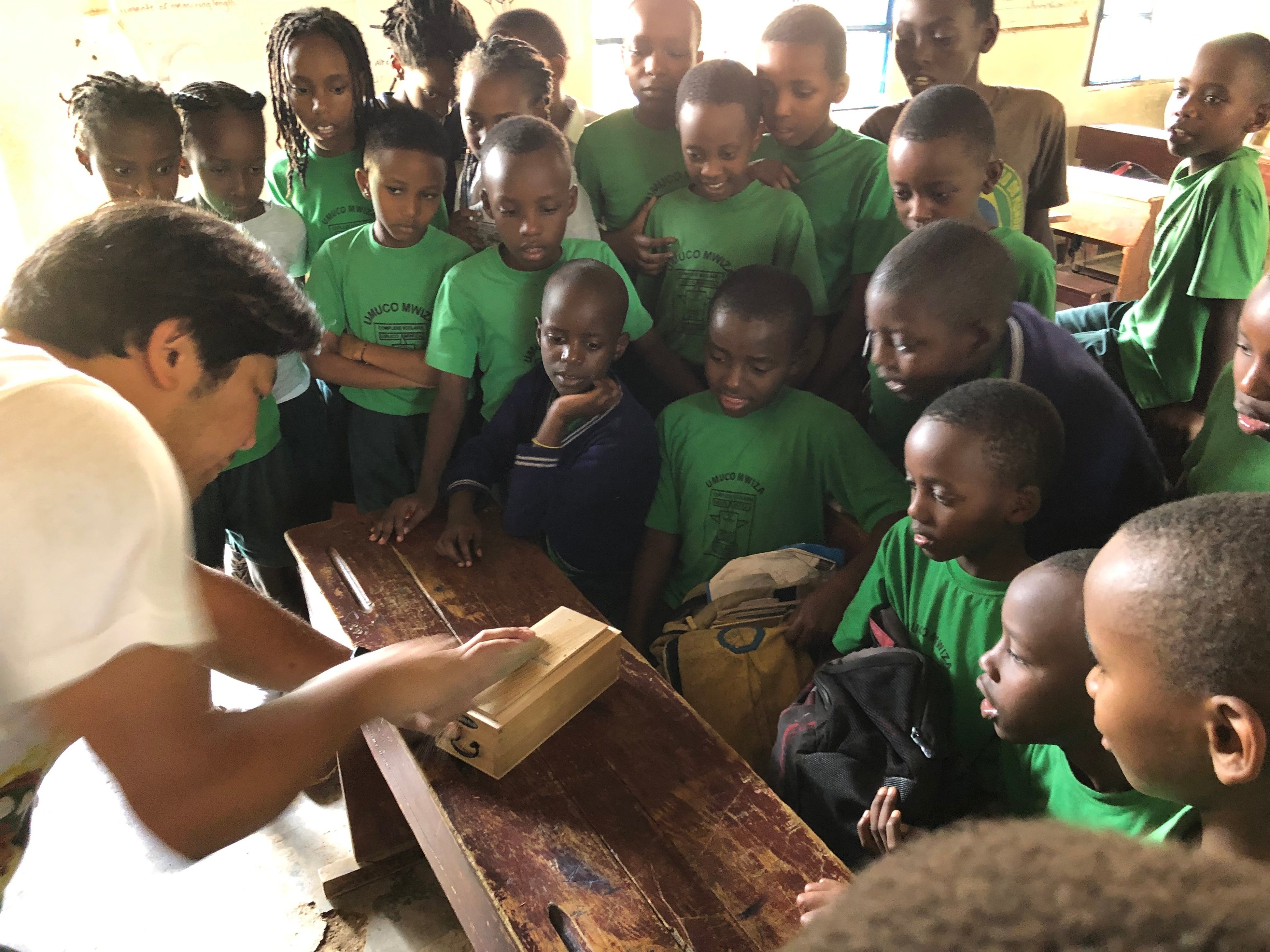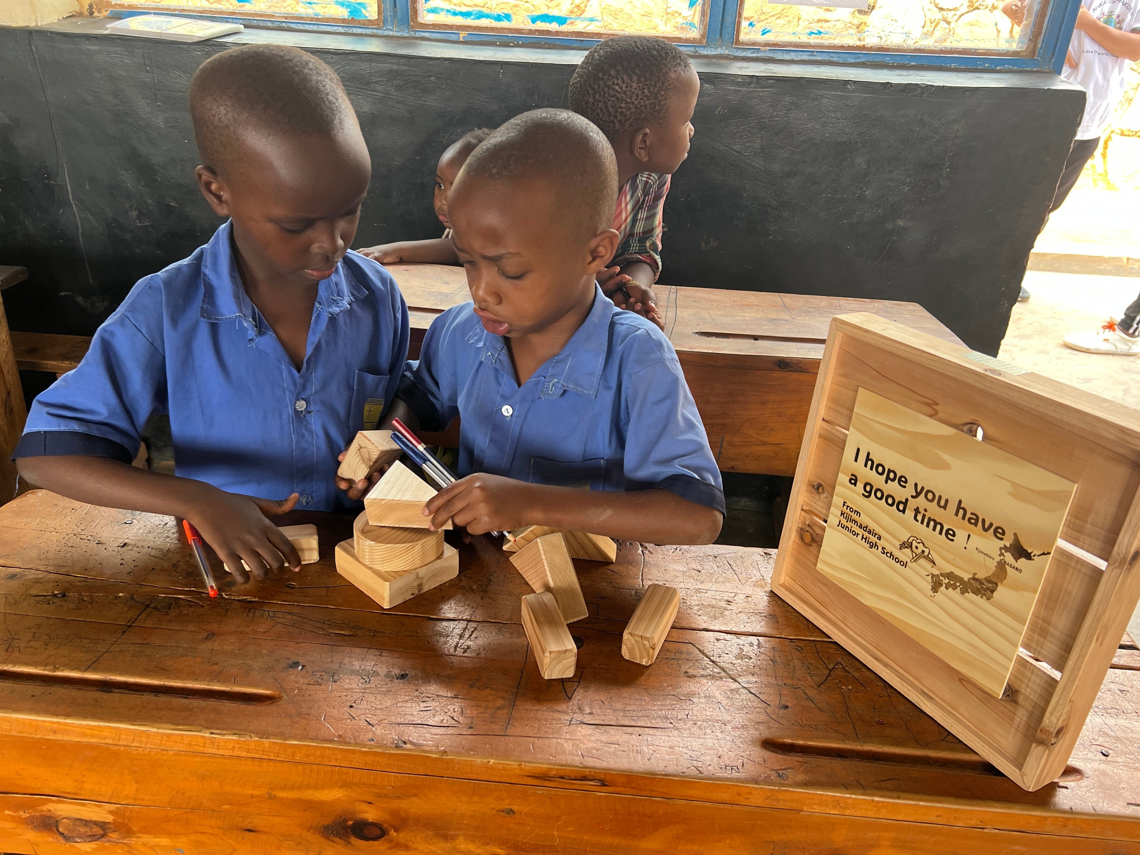 地域の木材で作った積み木ブロックを使い“崩れにくい構造”を学ぶルワンダの防災授業へ展開。低学年でも理解できる体験型の耐震学習として現地に根づいています。