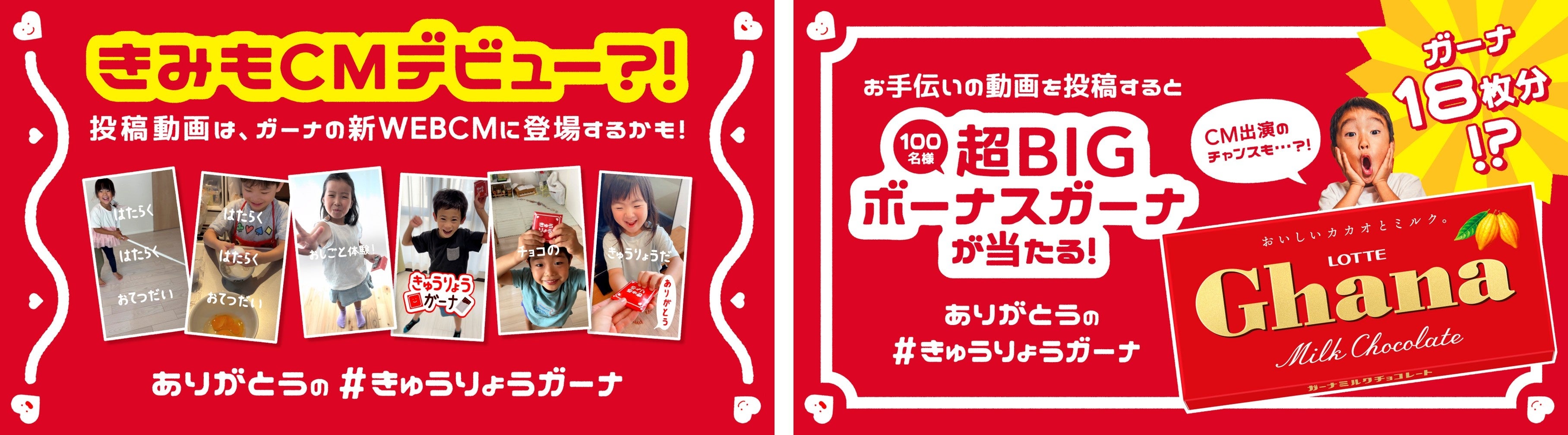 同時に、全国のご家庭で撮影された、お子さまの“お手伝い動画”を募集するSNSキャンペーンも開催します。参加いただいた方の中から、抽選で100名様に、超BIGボーナスガーナ(BIGガーナパッケージにガーナミルク18枚入り)をプレゼント。