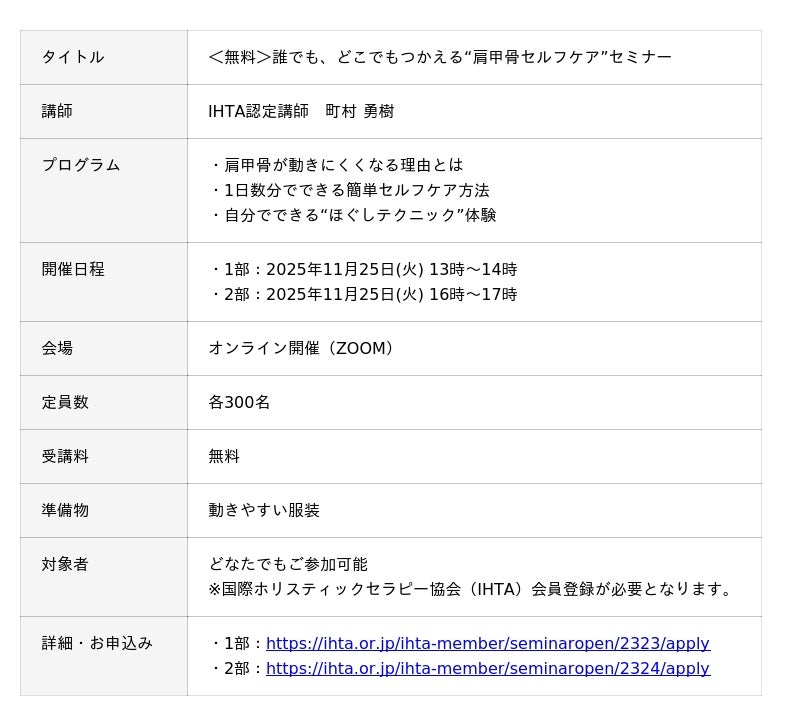 【(一社)国際ホリスティックセラピー協会(IHTA)】【無料オンライン開催】つかえる整体「肩甲骨セルフケア」オンラインセミナーを2025年11月25日に開催