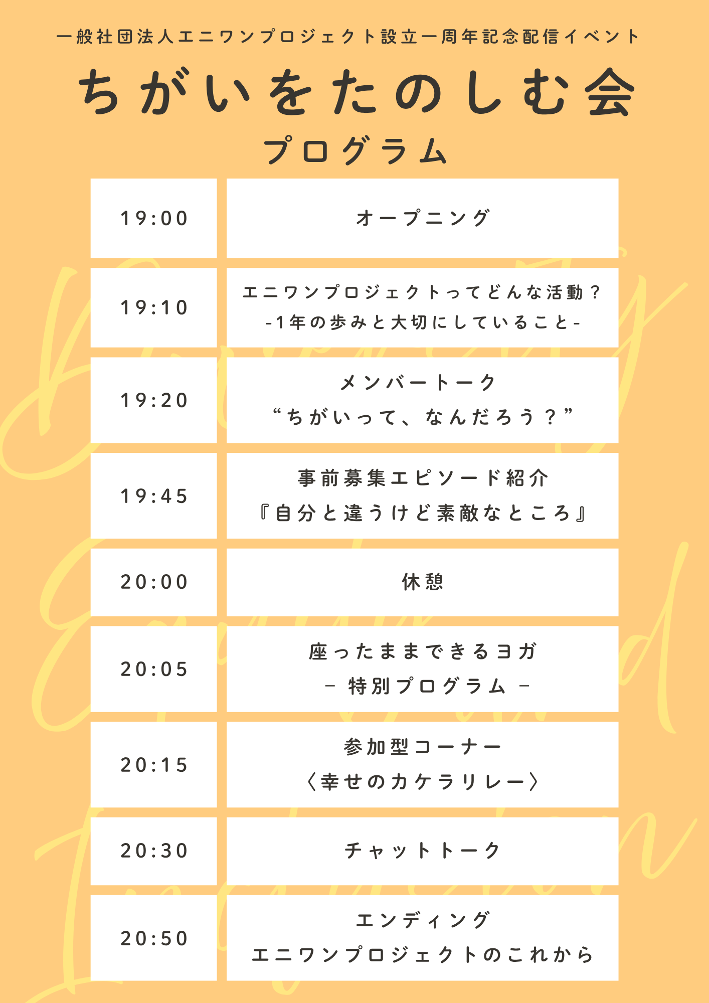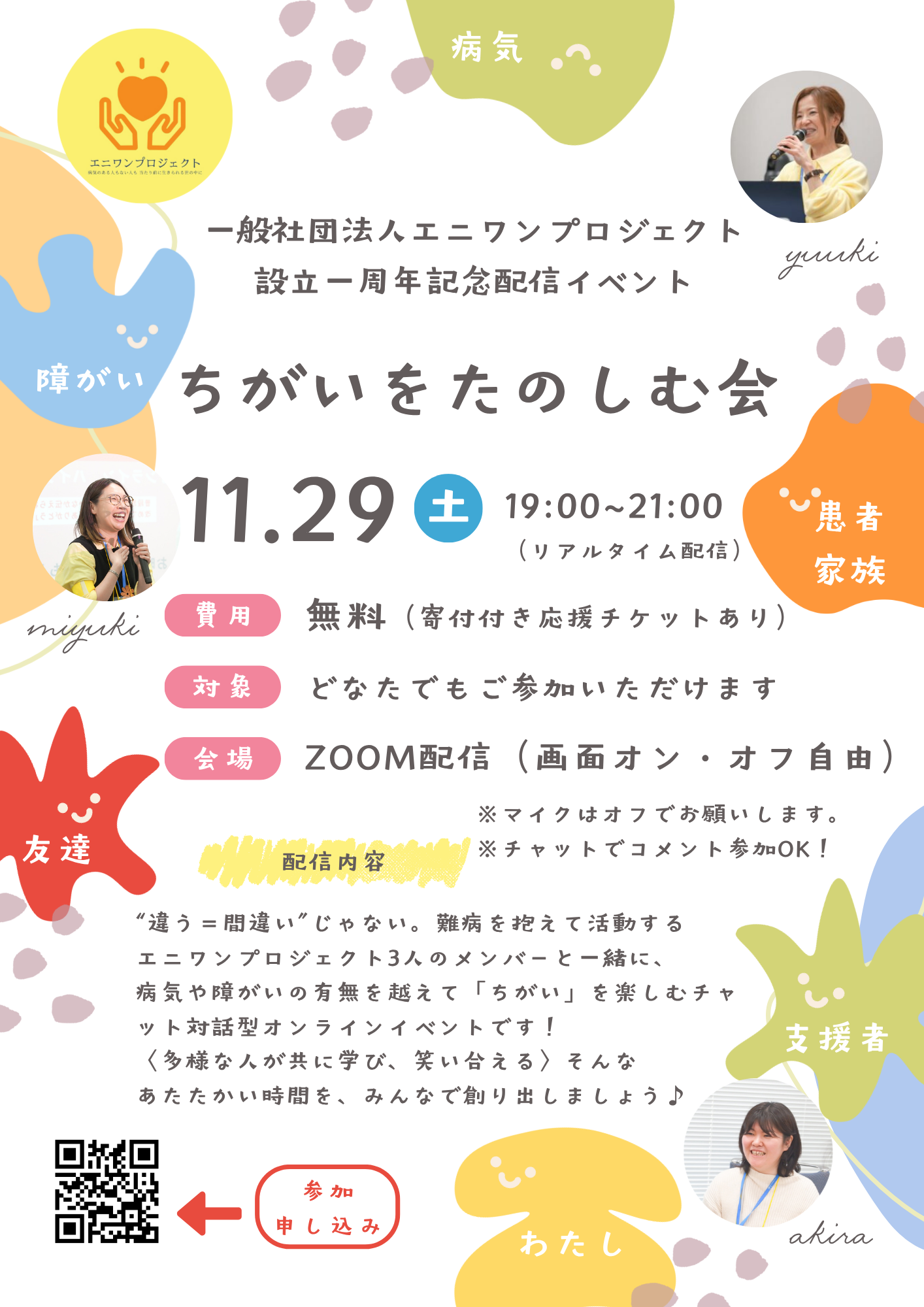 一般社団法人エニワンプロジェクト(本社:東京都練馬区、代表理事:狐崎友希)は、11月29日(土)19:00より一般社団法人設立1周年記念イベント【ちがいをたのしむ会】をZOOM配信にて開催いたします。