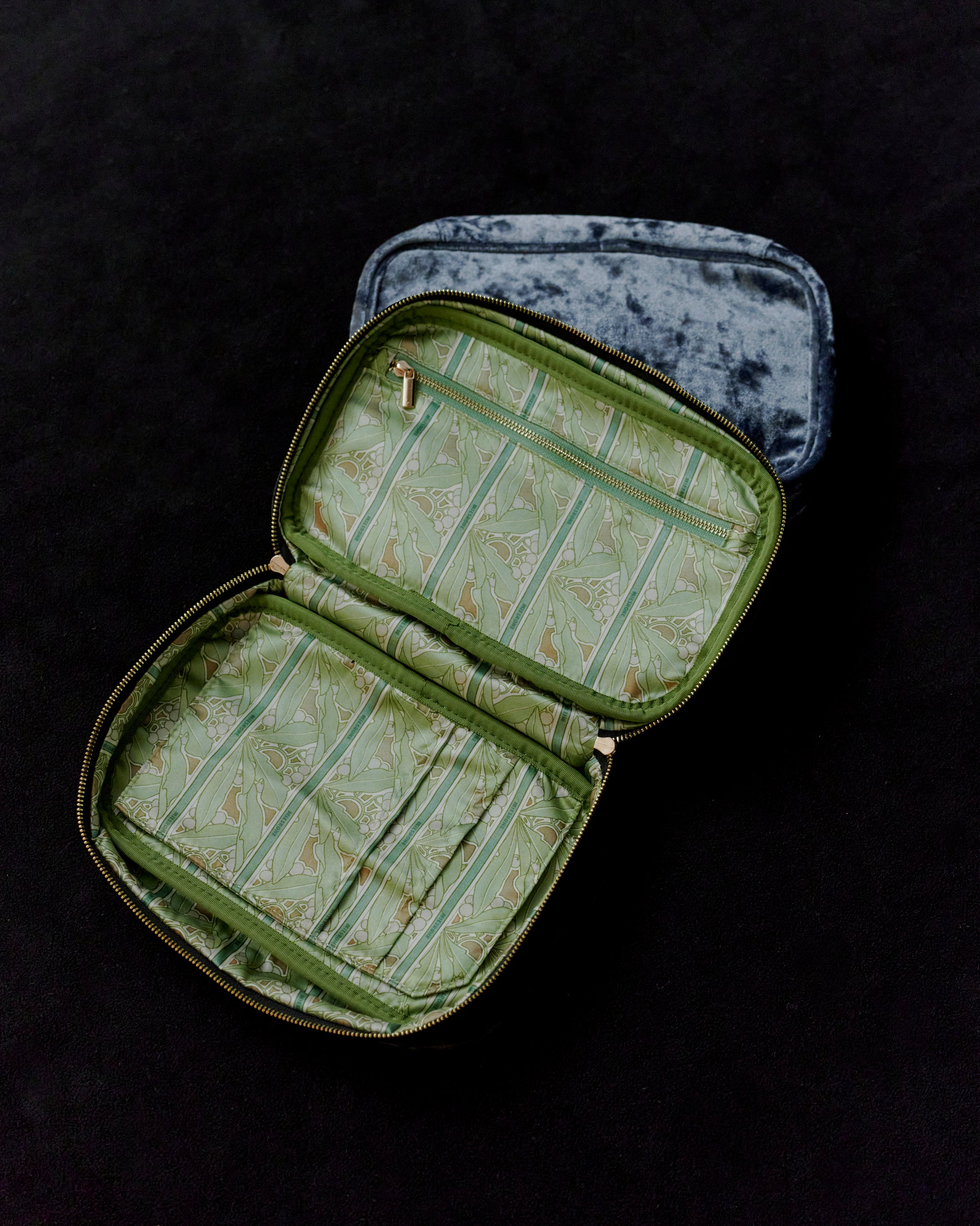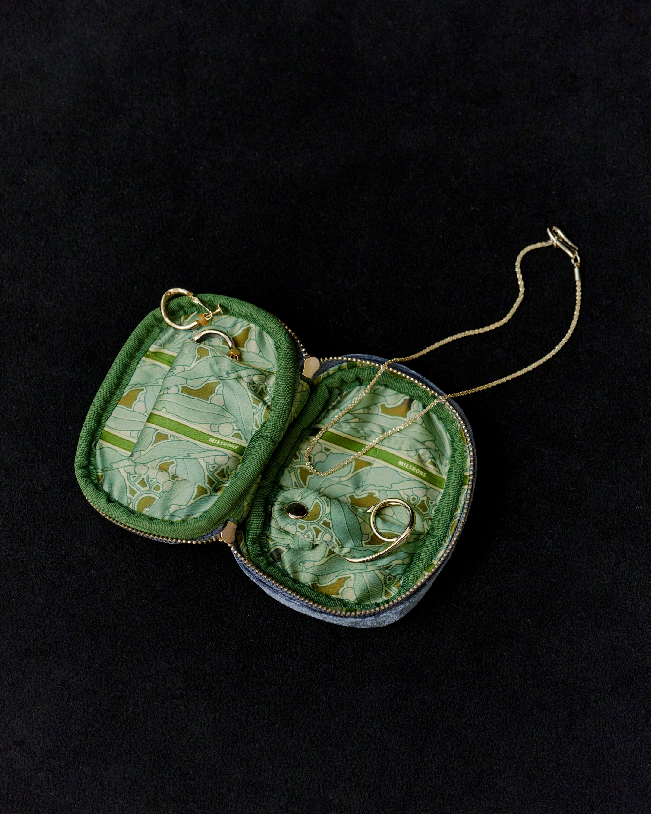 月桂樹のプリントが印象的な、持ち運び可能なアクセサリーポーチ。