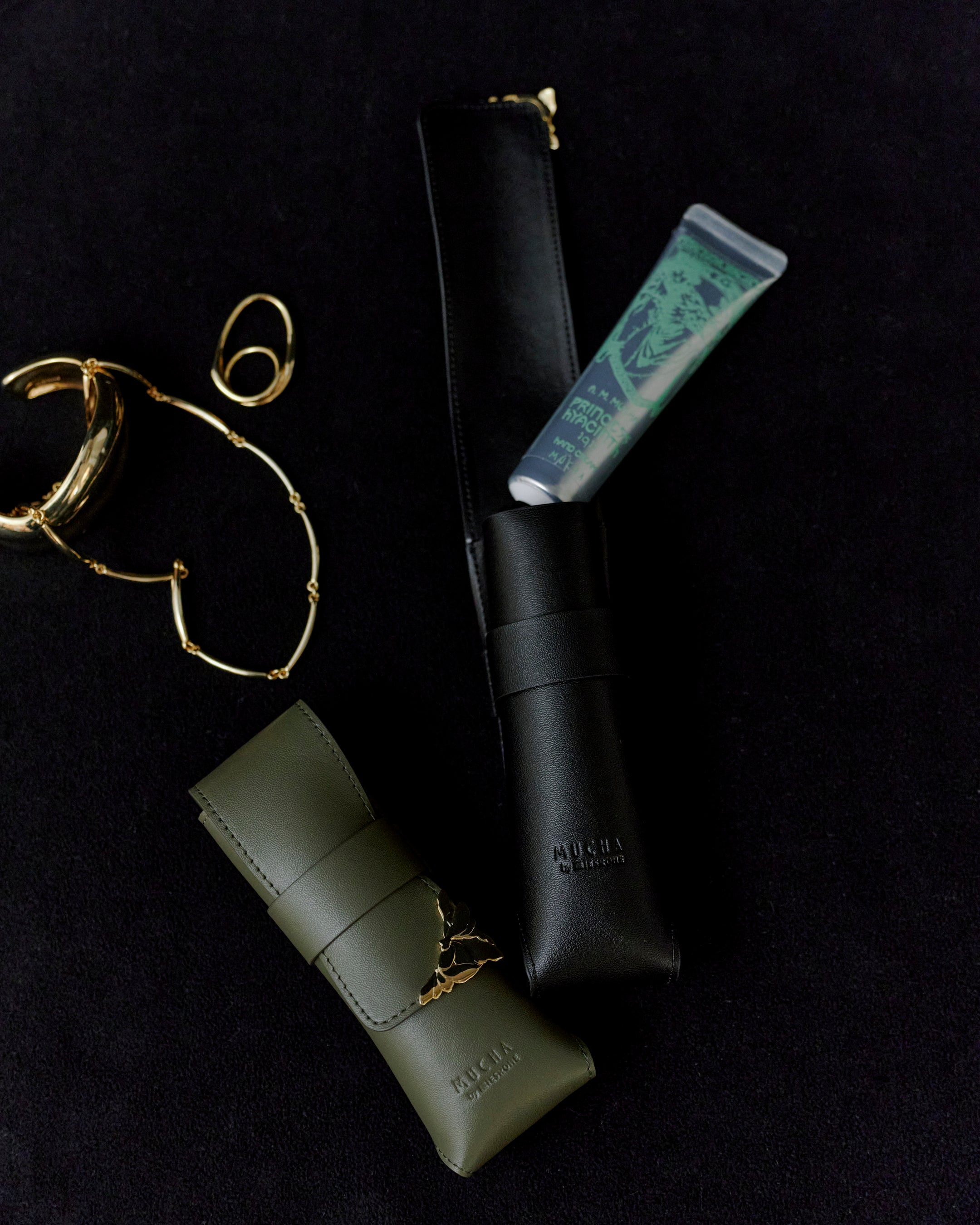 月桂樹のリーフ柄をかたどったモチーフが華やかさをプラスしてくれるハンドクリームケースと、MUCHAオリジナルハンドクリーム、シアー巾着の3点がセットになった、ホリデーギフトに最適なアイテム。