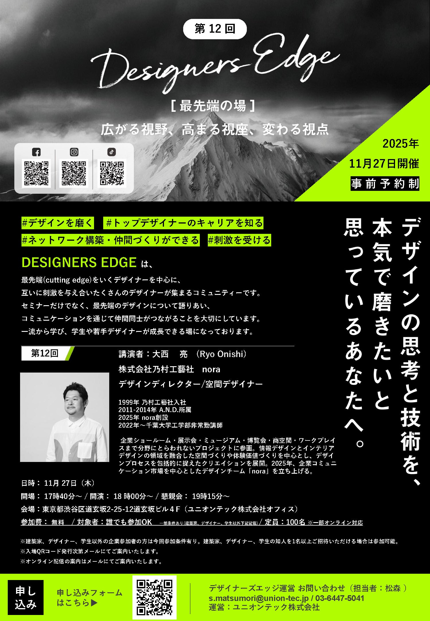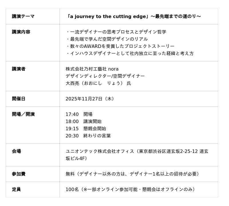 オフィスやクリニックを中心とした空間の内装デザイン・設計・施工を手掛けるユニオンテック株式会社(東京都渋谷区、代表取締役 大川祐介、以下「当社」)が企画・運営する、空間デザインの未来を切り拓くクリエイターのための対話型イベント「Designers Edge(デザイナーズエッジ)」の第12回(11月27日開催)に、株式会社乃村工藝社(東京都港区、代表取締役 社長執行役員 奥本清孝、以下「乃村工藝社」)noraのデザインディレクター/空間デザイナー 大西亮氏の登壇が決定しました。