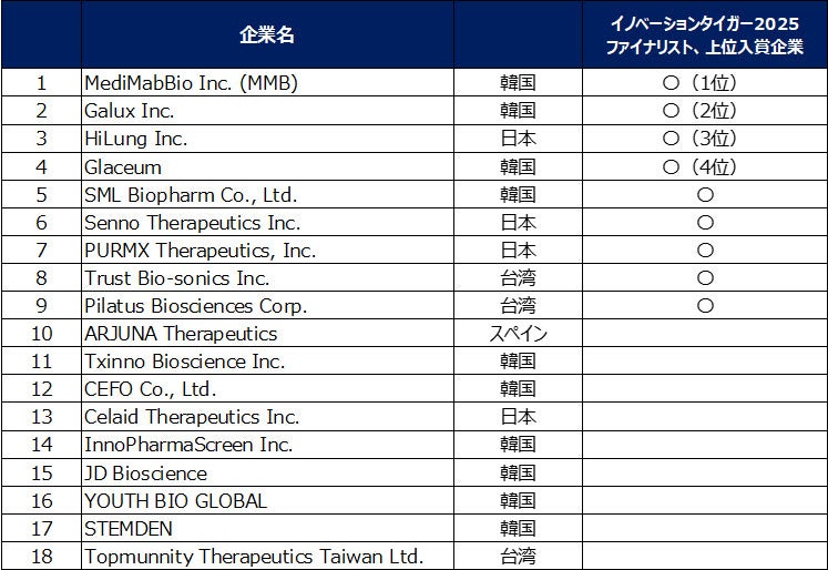 ・製薬企業の事業開発経験を持つ専門家による厳正な審査を経て、日本・韓国・台湾の18社が選抜