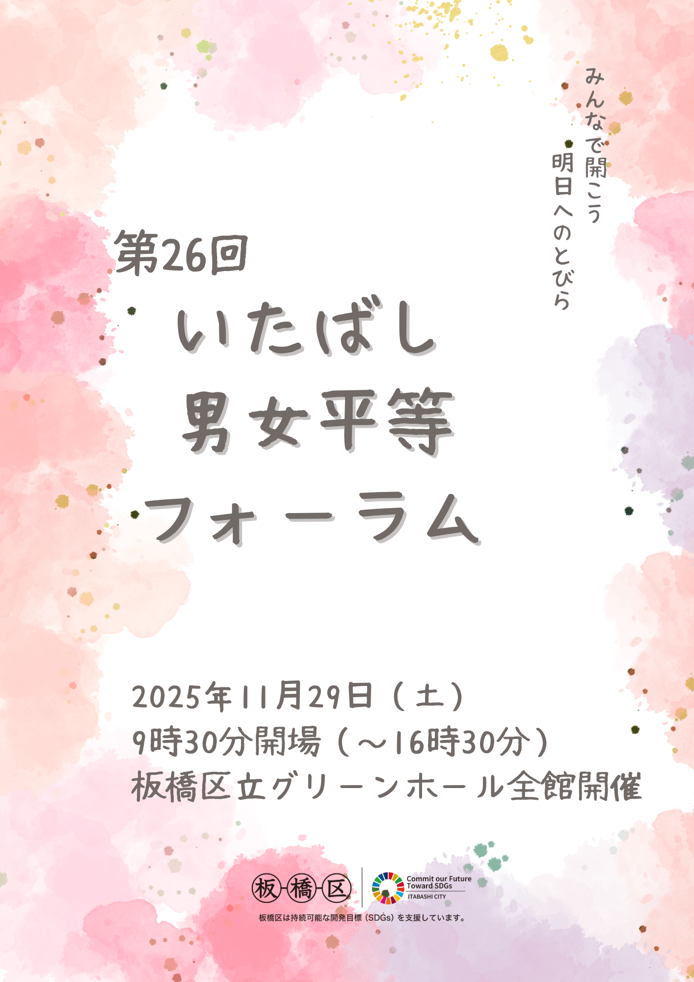 板橋区では、男女平等参画社会の実現に向けて、課題・解決方法を探り、男女がいきいきと暮らせるまちづくりをめざし、11月29日(土)に「第26回いたばし男女平等フォーラム」を開催します。併せて、「エシカル消費(人・社会・地域・環境に配慮した消費行動)」をテーマとした生活展を同時開催します。