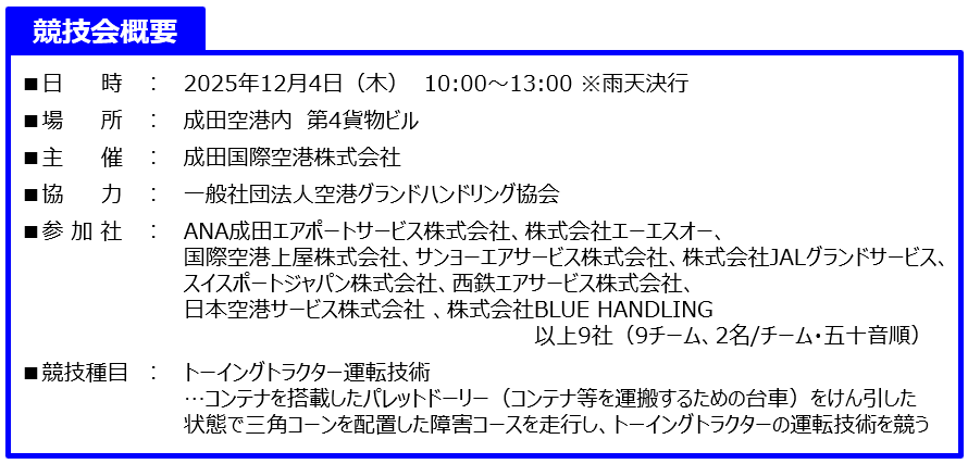 今回の競技会には過去最多となる9社が参加し、日々成田空港の安全運航を支える地上作業(ランプ ハンドリング業務)を担うスタッフが、日頃の業務で培った技術やノウハウを発揮し、優勝を目指します。