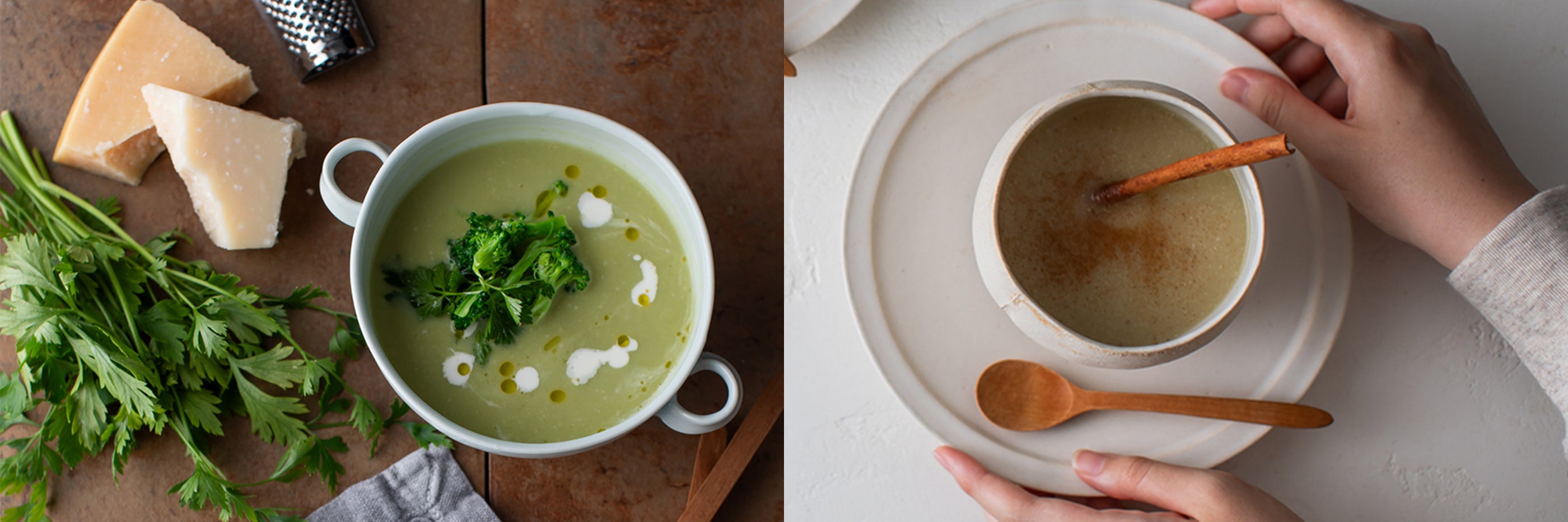 チーズ香るブロッコリーポタージュ、さつま芋とりんごのあったかスムージー