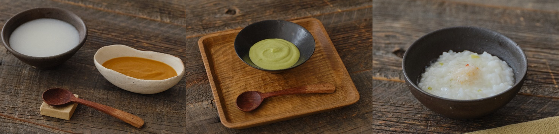 【左から】さばカレー&おかゆゼリー、ブロッコリーと豆乳のディップソース、基本の中華粥