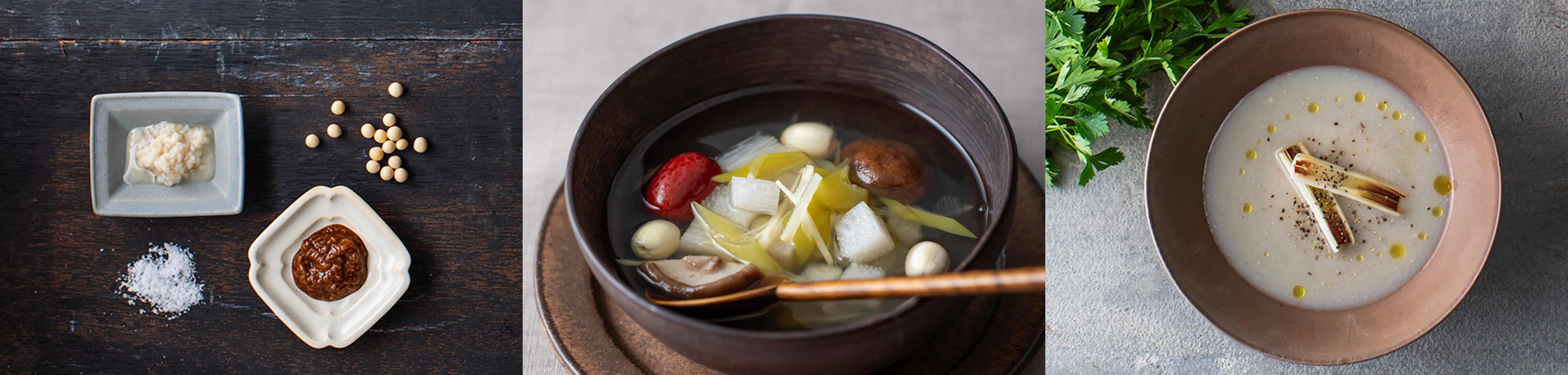 【左から】塩麴/しょう油麹、冬の薬膳スープ(生姜とネギと長芋のスープ)、里芋と長ねぎのポタージュ(煮干し使用)