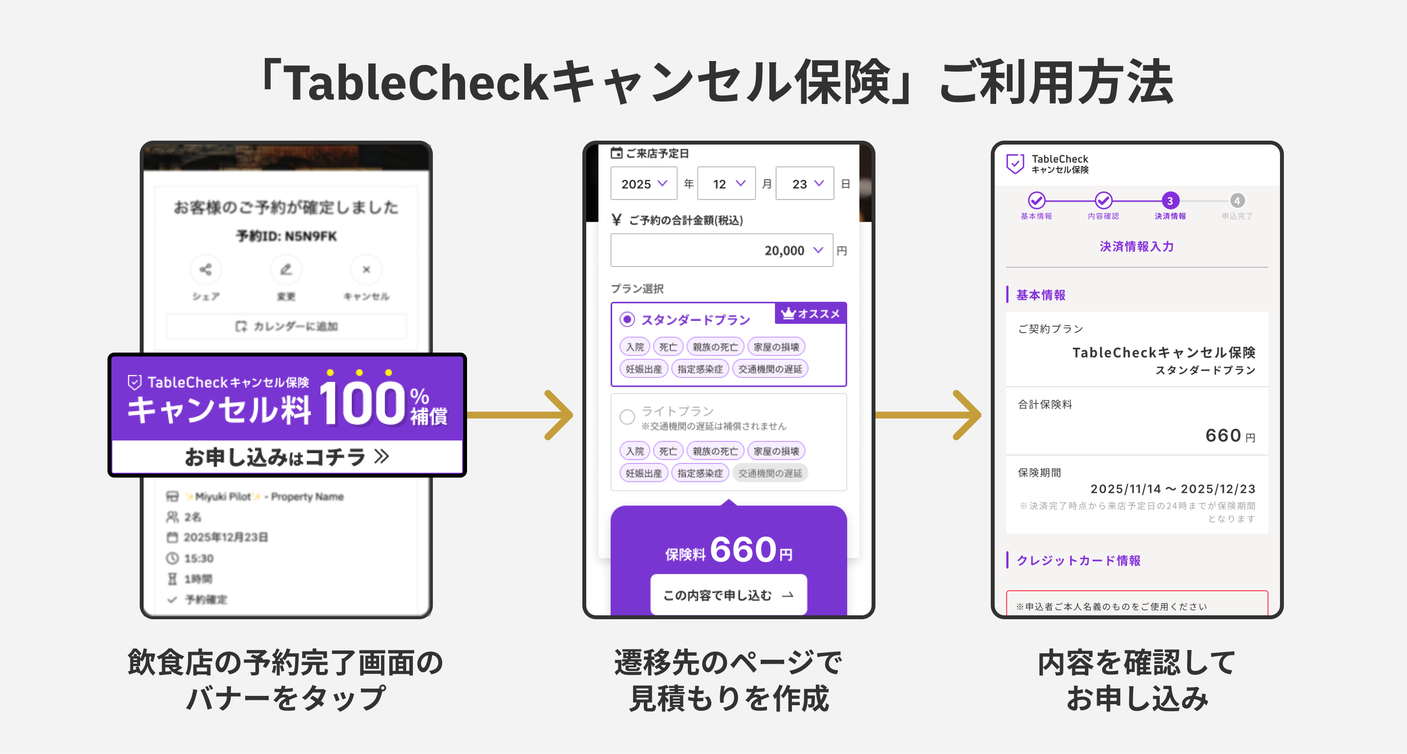 - TableCheckの予約完了画面から、スムーズに保険申し込みが可能。※加入から保険金請求まで、簡単に手続き可能。※完全事前決済またはクレジットカード事前登録が必要な予約が対象。