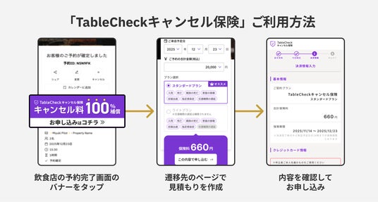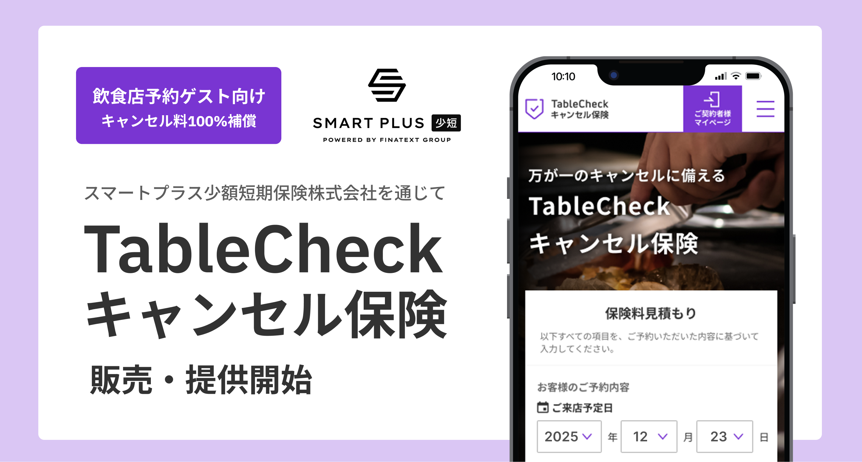 世界中のレストランとゲストをつなぐプラットフォーム「TableCheck」を提供する株式会社TableCheck(本社:東京都中央区、代表取締役社長:谷口 優、以下、「テーブルチェック」)は、2025年11月13日(木)より、スマートプラス少額短期保険株式会社(代表取締役CEO:小山 宏人、以下「スマートプラスSSI」)と連携し、スマートプラスSSIを通じて、飲食店予約ゲスト向けのキャンセル保険「TableCheckキャンセル保険」の提供を開始いたしました。