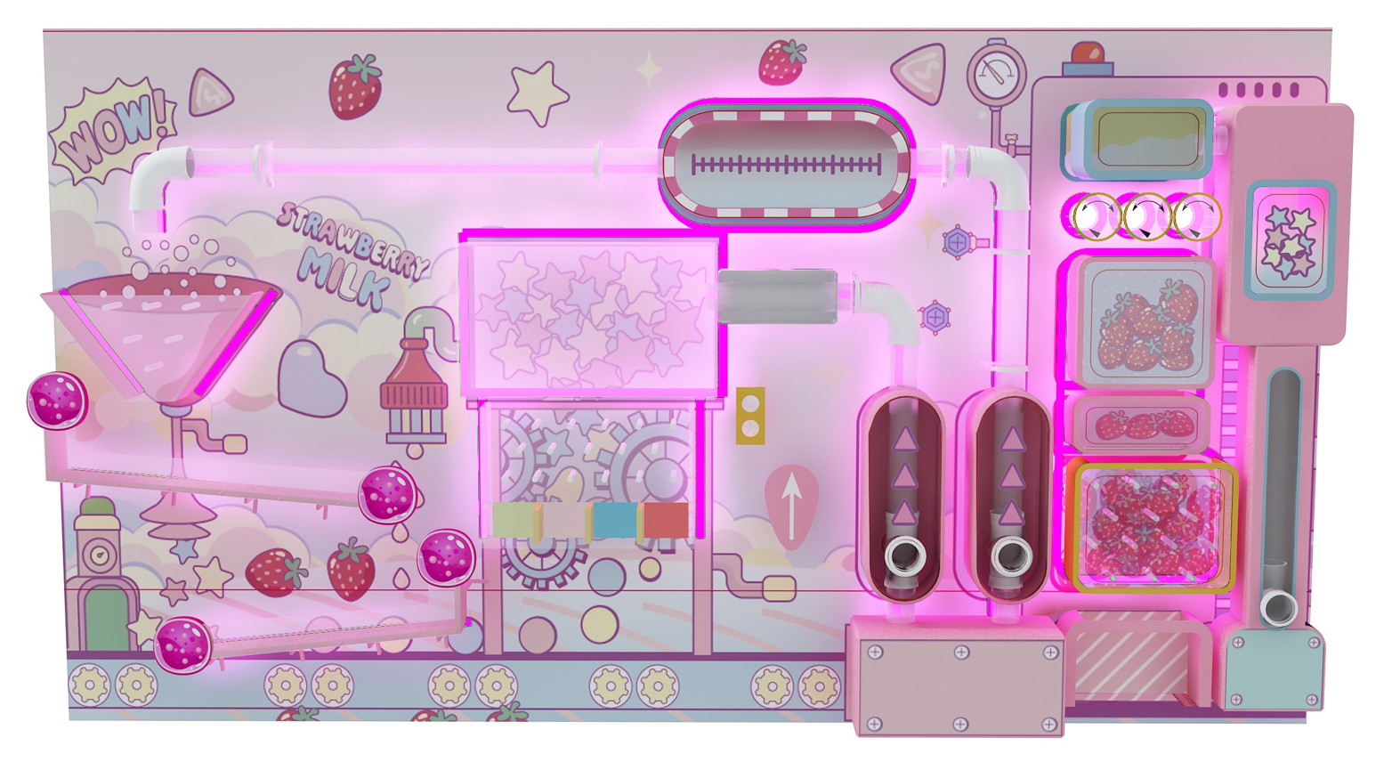 「いちごみるくシューター」は、ボールプールの壁面に設置された体験型遊具です。ボールを投入すると、キャンディ製造の工程をモチーフにしたユニークな仕掛けによって、ボールが運ばれていく遊具です。