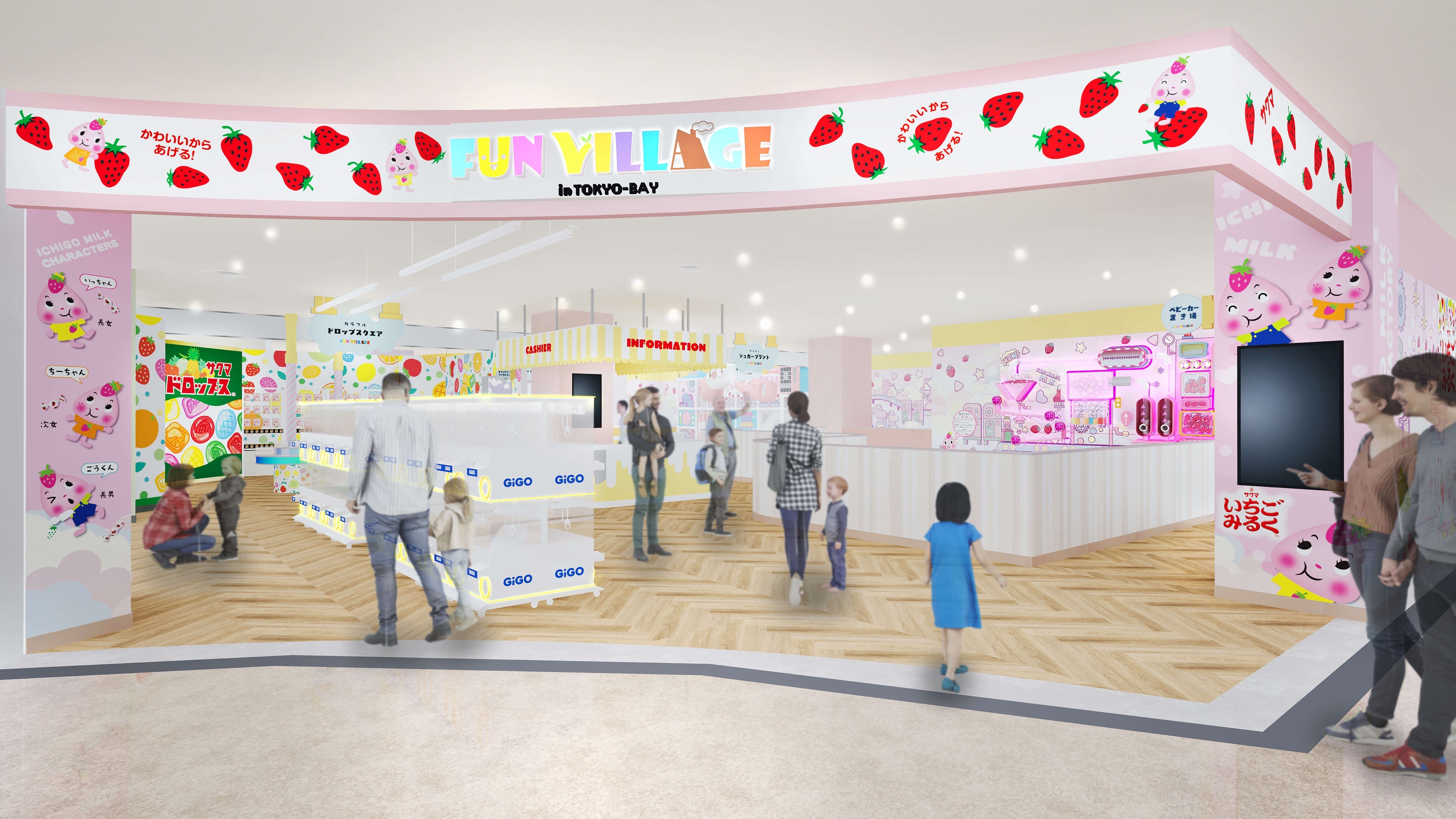 JR京葉線「南船橋」駅から徒歩約5分、千葉県船橋市の日本最大級のショッピングモール「ららぽーとTOKYO-BAY」の南館3階に「FUN VILLAGE in TOKYO-BAY」がオープンします。「FUN VILLAGE」は、当社が運営するファミリー向け屋内パークで、お菓子メーカーとのコラボレーションは国内初。同フロアには当社のアミューズメント店舗である「GiGOららぽーとTOKYO-BAY」(※1)も出店しています。「FUN VILLAGE in TOKYO-BAY」は、サクマ製菓のキャンディ「いちごみるく」をテーマにしたコンテンツを体験できる屋内パークです。キャンディ作りの工程をイメージしたボールプールやエアー遊具、ミニボルダリングの壁面など「いちごみるく」にあふれた空間で遊んでキャンディ作りを“体感”した後は、物販コーナーへ。「キャンディの詰め放題」や「サクマ製菓のキャンディ商品販売」、「コットンキャンディ自販機」、キャンディにちなんだワークショップ「キャンディラボ」など、家族みんなで楽しめるコンテンツをご用意しています。
