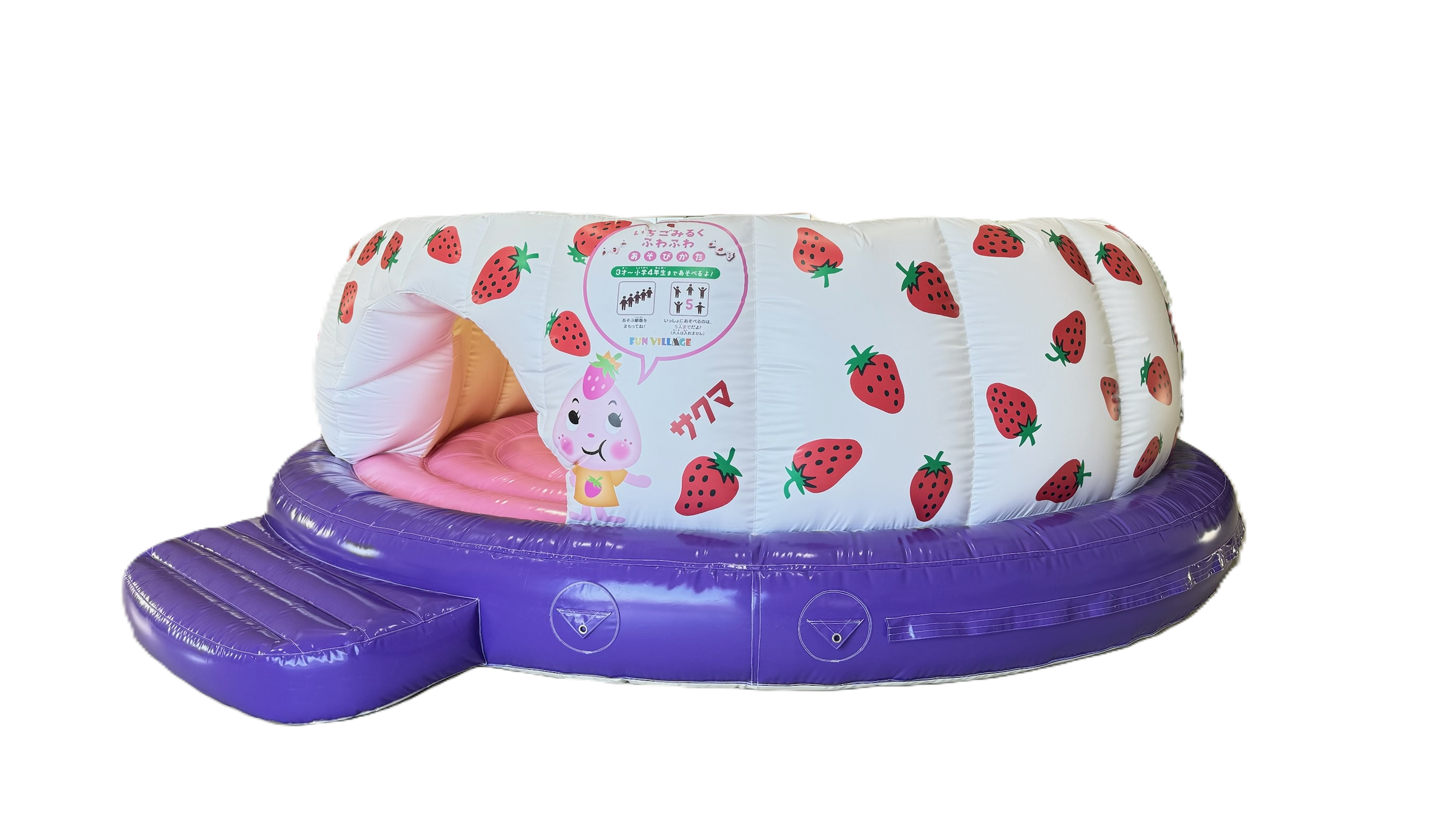 「いちごみるく ふわふわ」は、出来上がったキャンディを包装する「コーティング」をイメージした立体エアー遊具です。遊具の中に入って遊べます。