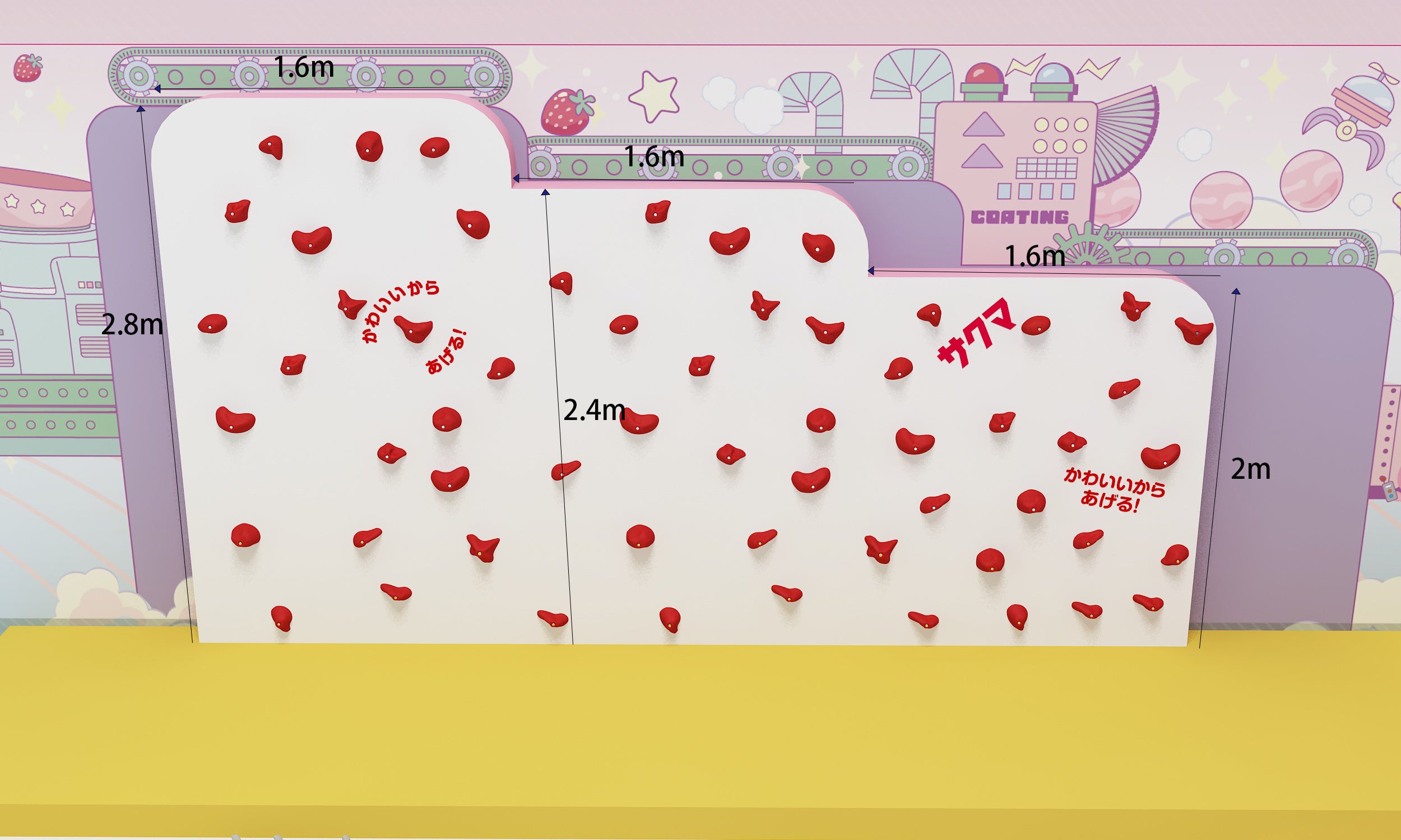 「いちごみるくボルダー」は、「いちごみるくコンベアー」で出来上がったキャンディを散りばめたイメージの壁面を使ったミニボルダリングです。