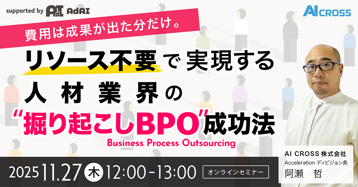 AI CROSS株式会社(本社:東京都港区、代表取締役CEO:原田 典子、以下「AI CROSS」)は、当社主催の無料オンラインセミナー「費用は成果が出た分だけ。 リソース不要で実現する人材業界の“掘り起こしBPO”成功法」を2025年11月27日(木)12時より開催します。