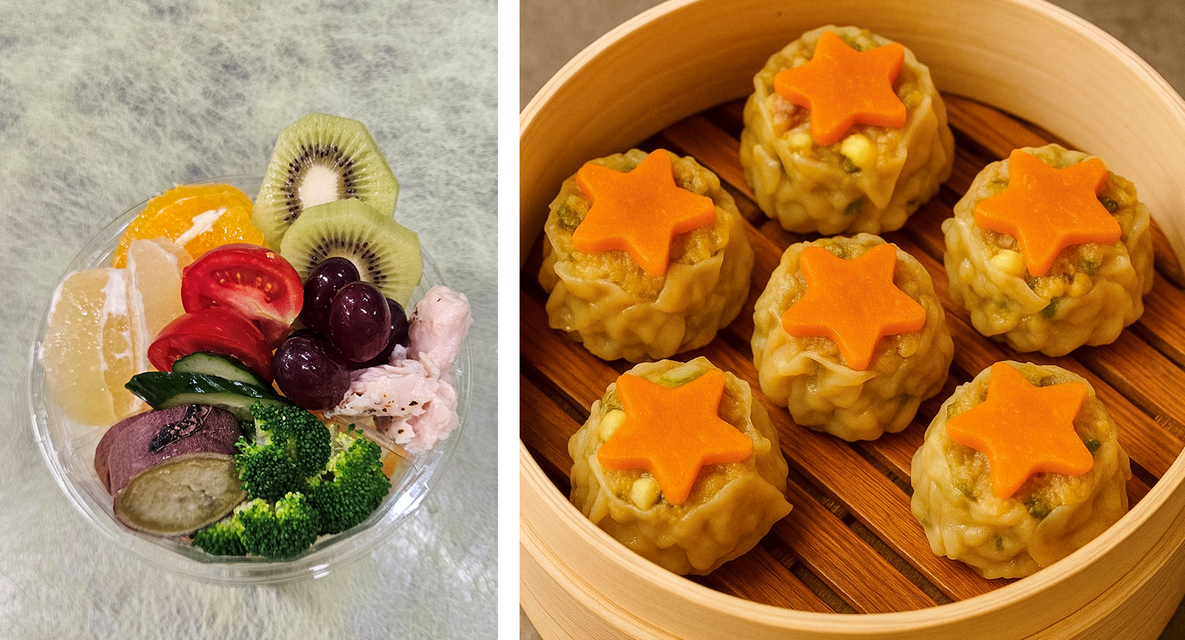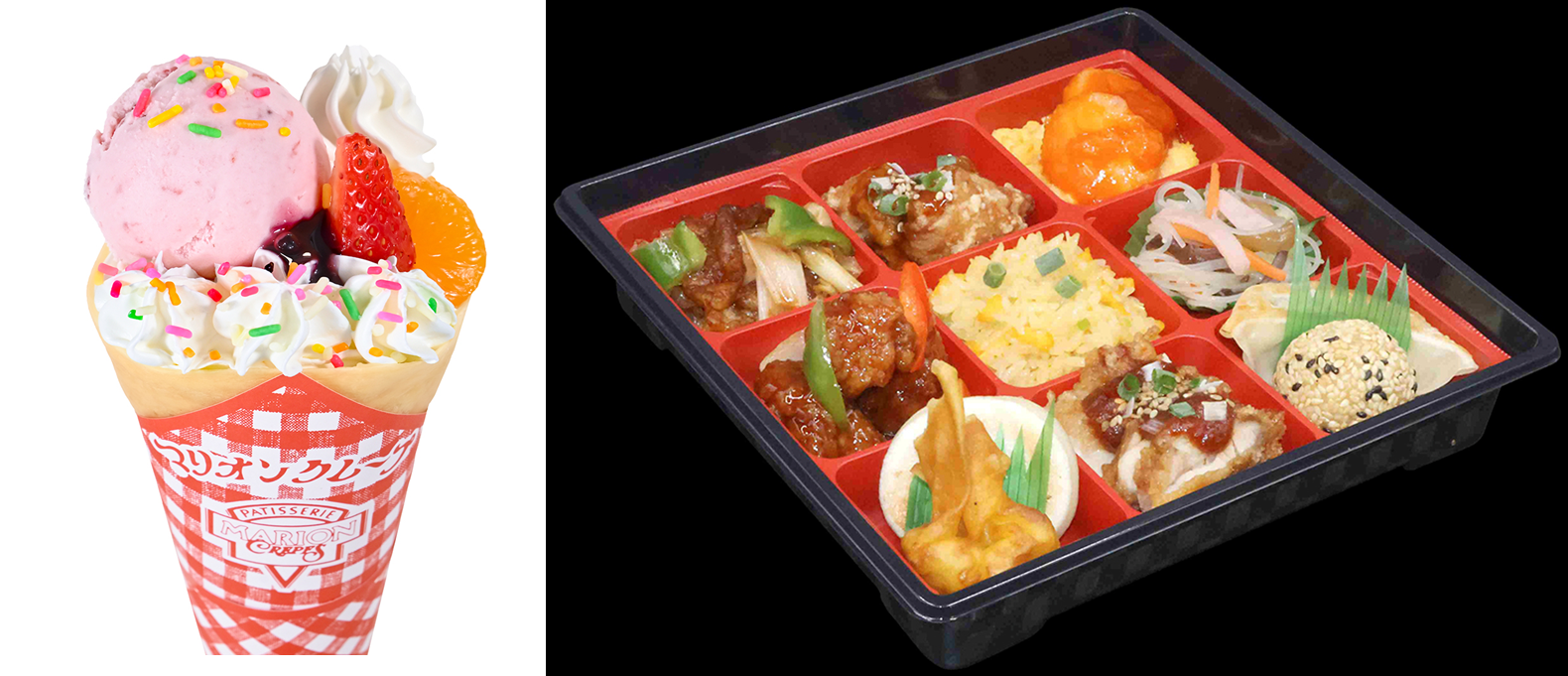 左:6年1組×マリオンクレープ「フルーツパラダイスクレープ」税込700円 右:6年2組×昇龍園「ガッツリ美味しい!満足弁当」税込1,380円