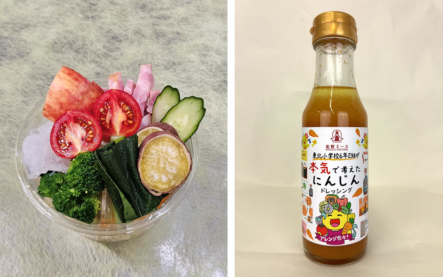 左:6年1組×澤光青果×尾崎ファーム「6年1組!!新座のうまうまサラダ」 税込1,300円 右:6年2組×北野エース×オジカソース「東北小学校6年2組が本気で考えたにんじんドレッシング」 税込600円