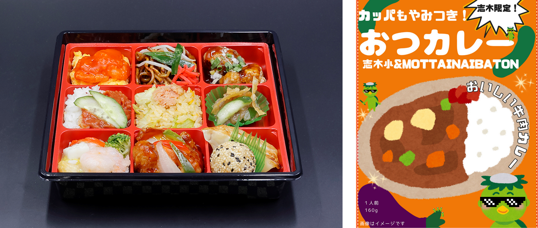 左:6年2組×昇龍園「ファミリーでもりもりさくら中華弁当」 税込1,380円 右:6年3組×MOTTAINAI BATON「カッパもやみつき!おつカレー(ビーフカレー)」 税込1,000円