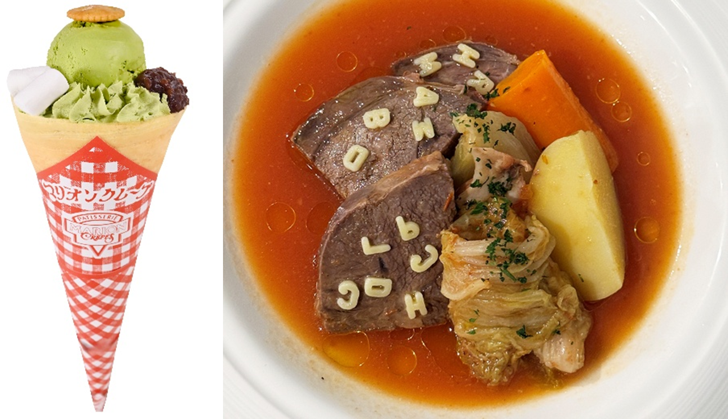 左:6年4組×マリオンクレープ「志木小6-4抹茶かっぱクレープ」 税込650円 右:6年5組×ラ・サンセリテ「ABCポトフ・ド・ブッフ」 税込1,300円
