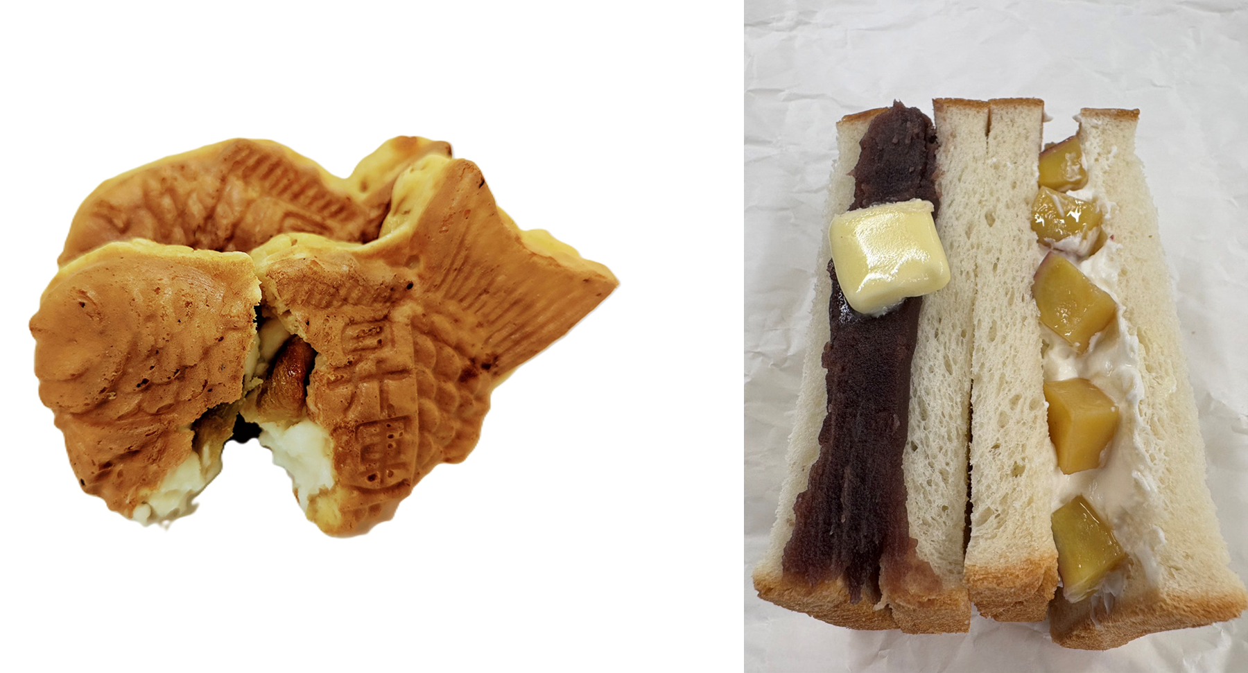 左:6年4組×おめで鯛焼き本舗「さつまいもとチーズのぽぽ鯛焼き」※非売品 右:6年4組×アサカベーカリー×青柳×OIMO BIYORI「I(ハート)朝霞サンドイッチ」税込880円