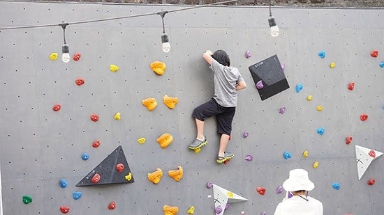本イベントの会場であるE-Parkは、スケートボードやボルダリングで遊べる屋外施設です。当日もスケボーエリア、ボルダリングウォール共に自由に遊べるようになっていますので、算数コンテンツで遊んだり、ボルダリングをしたり、スケートボードをしたり、また算数コンテンツで遊んだりと、参加者は自由に横断しながら体を頭を動かす遊びを楽しむことができます。