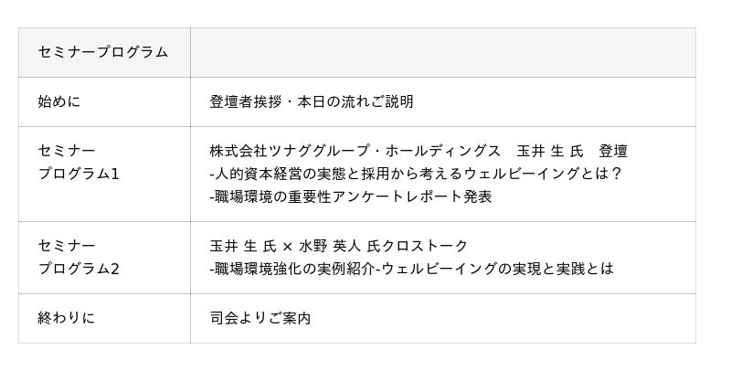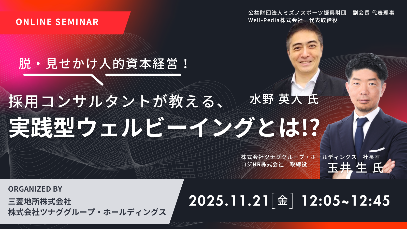 RPO(採用業務代行)・採用コンサルティングを行う株式会社ツナググループ・ホールディングス(本社:東京都中央区、代表取締役社長:米田光宏)は、2025年11月21日にオンライン配信にてセミナー『脱・見せかけ人的資本経営!採用コンサルタントが教える、実践型ウェルビーイングとは!?』を開催します。当日は株式会社ツナググループ・ホールディングス 社長室 玉井生氏と公益財団法人ミズノスポーツ振興財団 副会長 代表理事 水野英人氏を迎え、「脱・見せかけ人的資本経営」の実践をお伝えします。