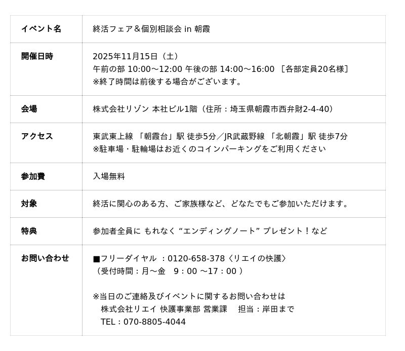 食と介護の生活サービスを提供する株式会社リエイ(本社:千葉県浦安市、代表取締役:椛澤 一)は、2025年11月15日(土)埼玉県朝霞市にて、「終活フェア&個別相談会」を開催いたします。