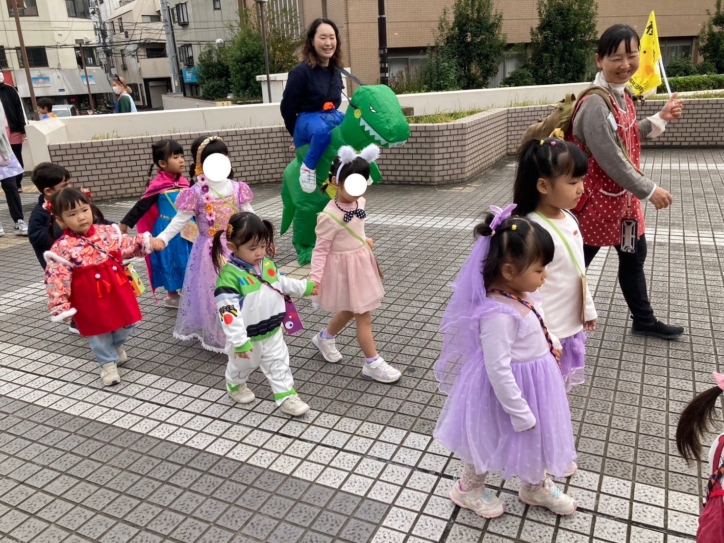 10月31日(金)、手作り衣装やご家庭からの衣装に身を包み、元気いっぱいにお散歩へ出発。色とりどりの仮装は小さなパレードのよう。道行く方からの「かわいい!」の声に、子どもたちも笑顔で手を振りました。
