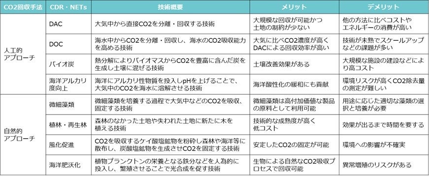 CDR・NETs領域の技術は、「人工的アプローチ」と「自然的アプローチ」に分類されます。