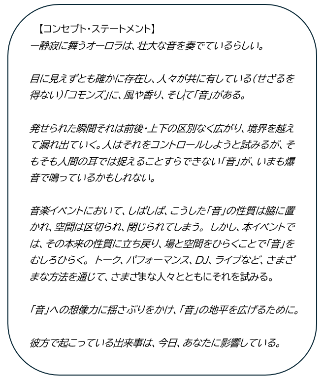 - CCBT初の音楽イベントSound Atlas #1 「極地からの音」:「音」の本質を、ライブ、パフォーマンス、DJ、インスタレーション、トークなど、領域を越えたコラボレーションで探る実験的音楽プロジェクト。本日11月13日(木)14:00よりチケット販売開始!
